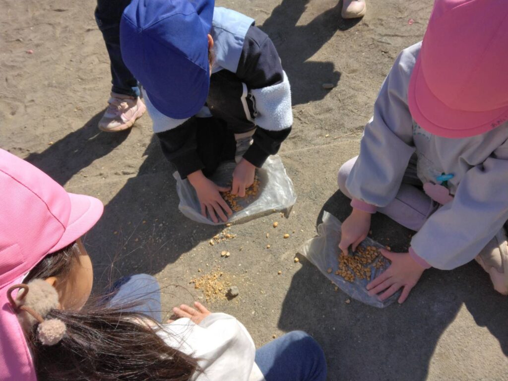 そのあとの外あそびでは、園庭の豆を拾ってお料理ごっこをして楽しむ姿がありました。