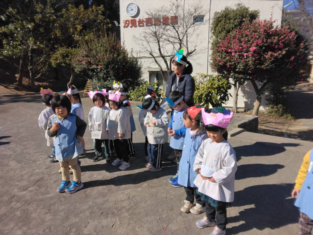 2月3日(火)にみんなで節分の豆まきをしました。年少さんと年中さんは自分の作った鬼のお面をかぶり、園庭に集まりました。
