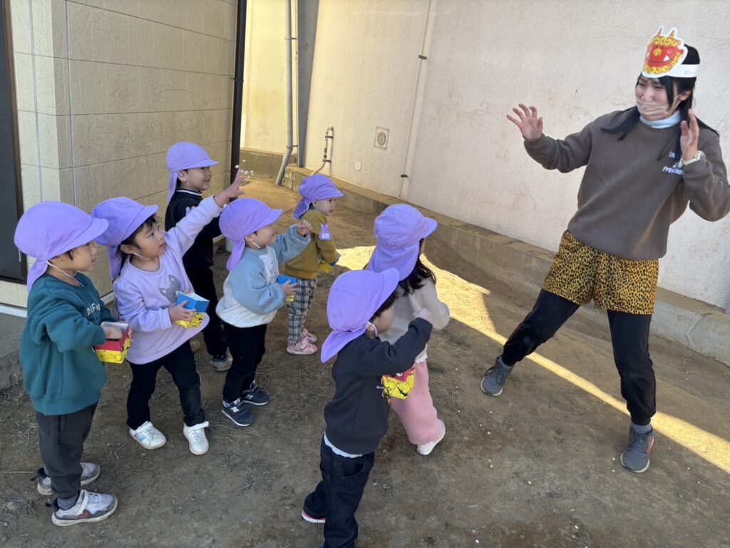また、うさぎ組さんは、担任のえみこ先生鬼に向かって豆まきをしました。えみこ先生鬼にも怖がっていた子もいました😂