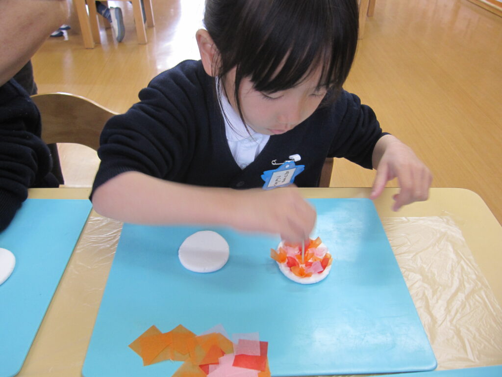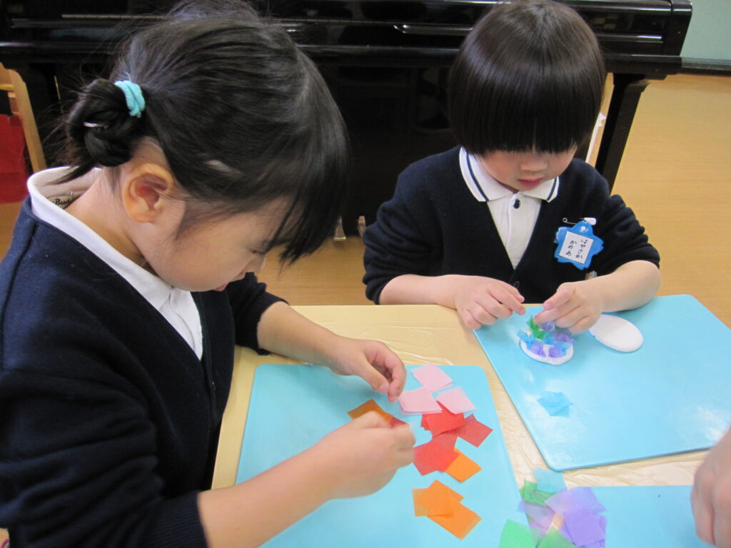 紙粘土に、お花紙をつまようじで差し込んで作りました。