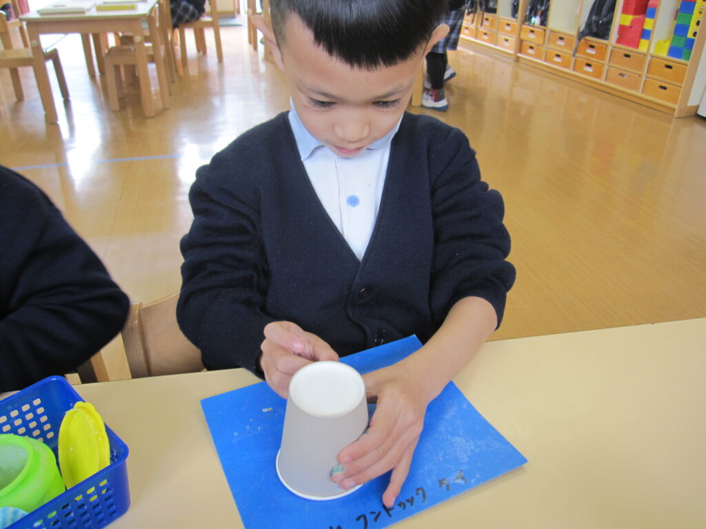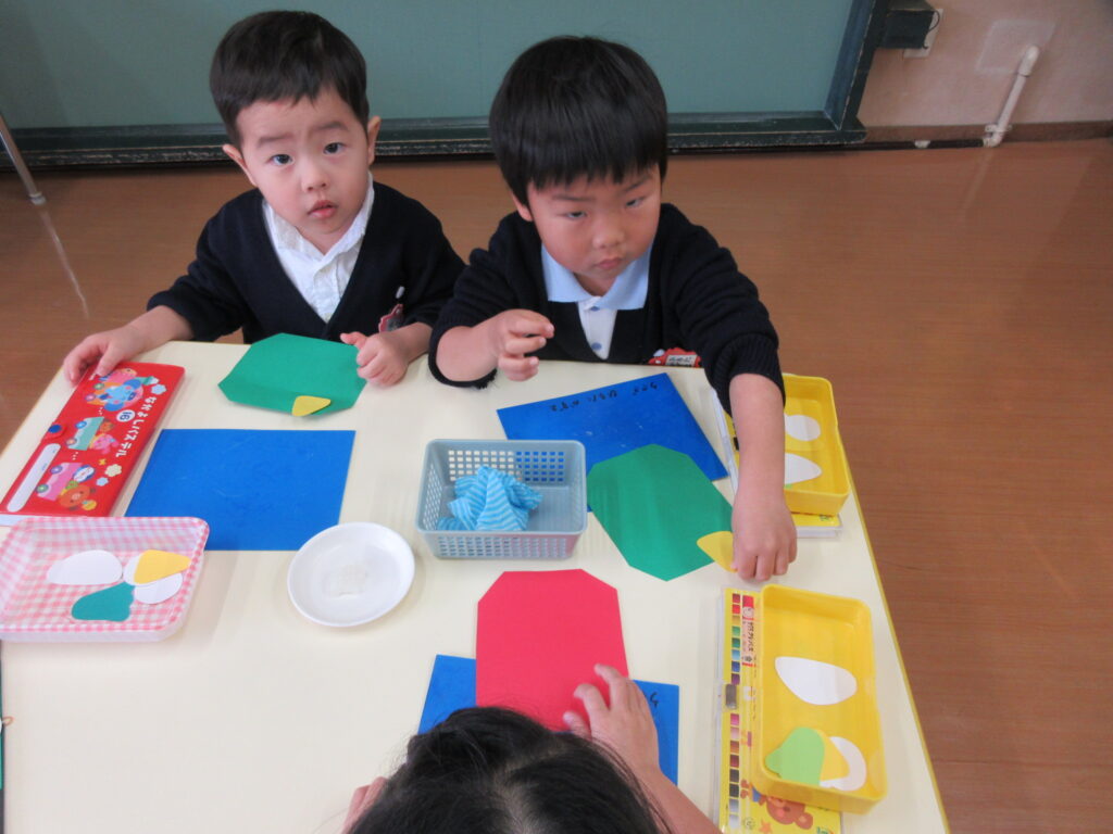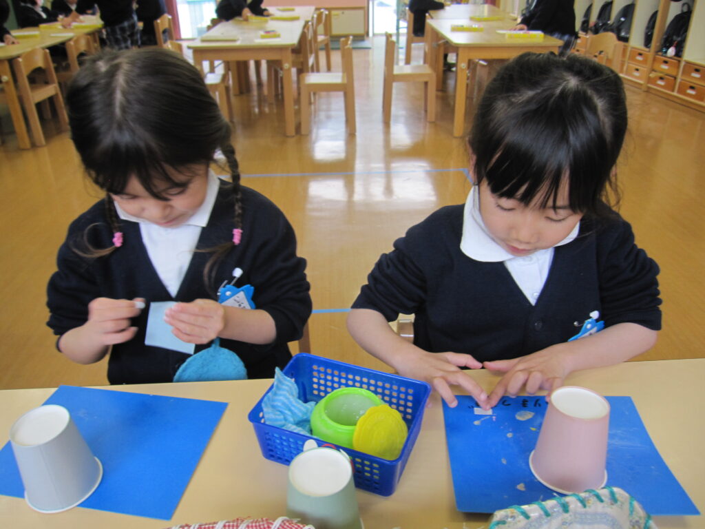 和紙が乾いたら、好きな色のお花紙を貼ります。