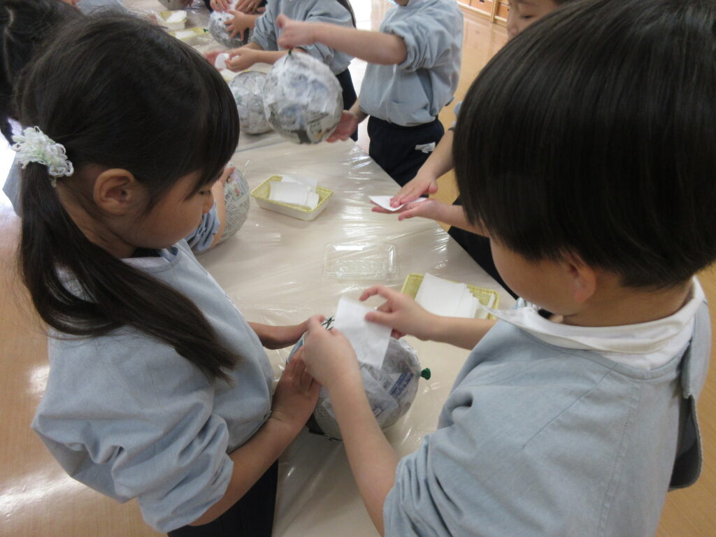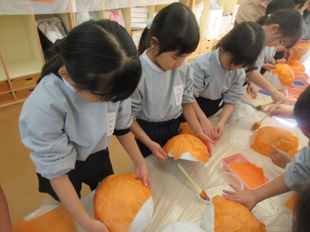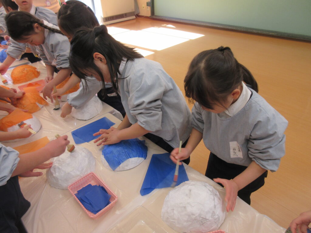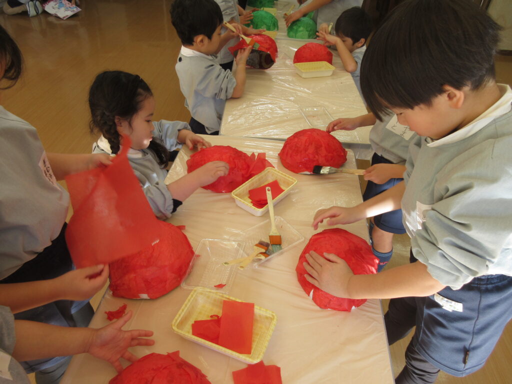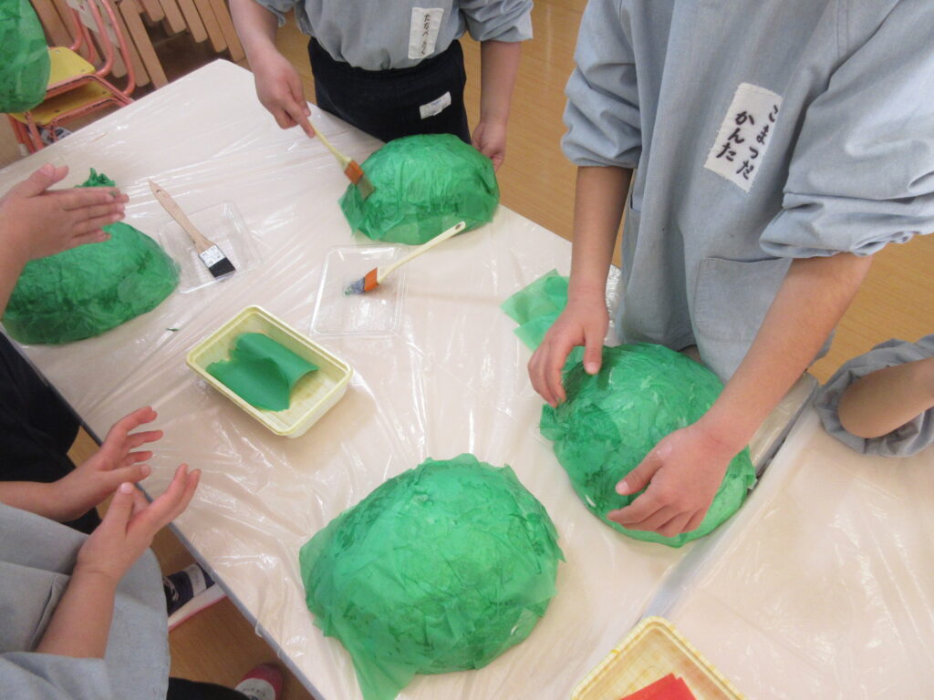 紙袋に絵の具で色を塗り、鬼の顔を作りました。