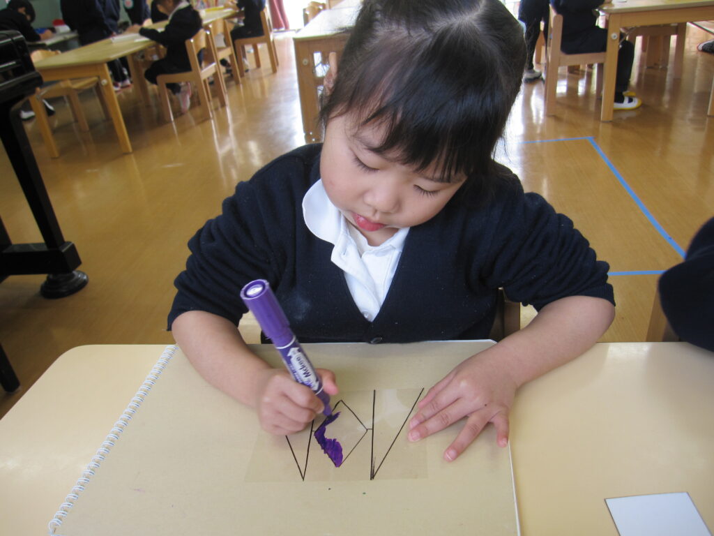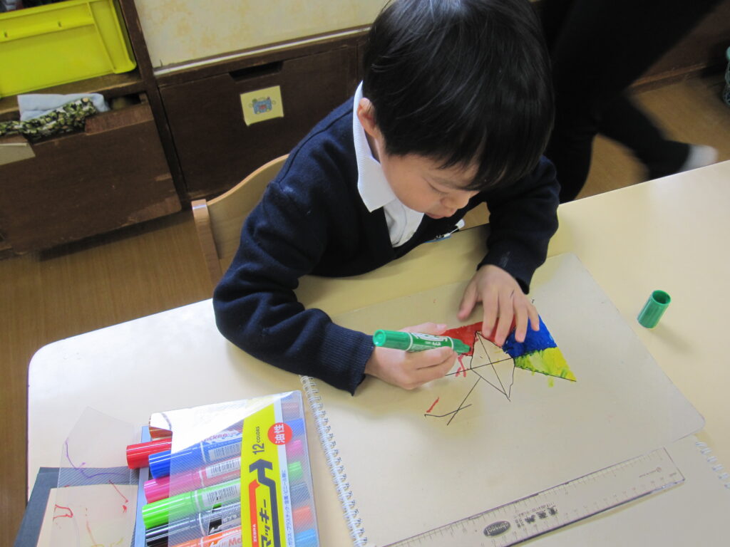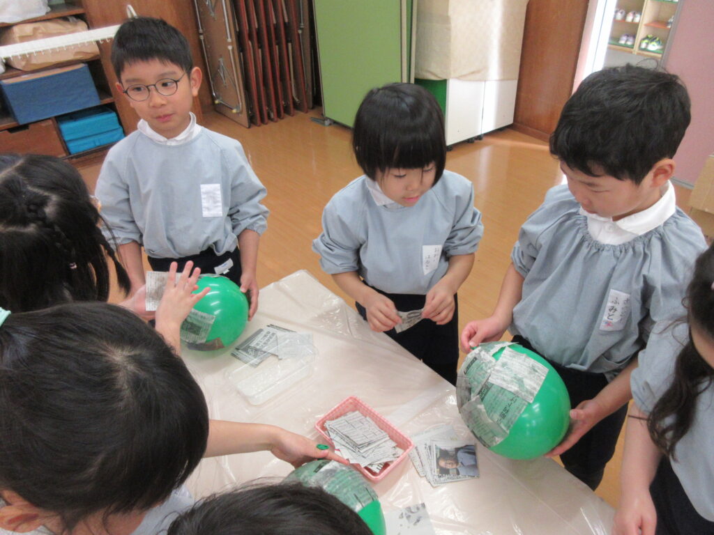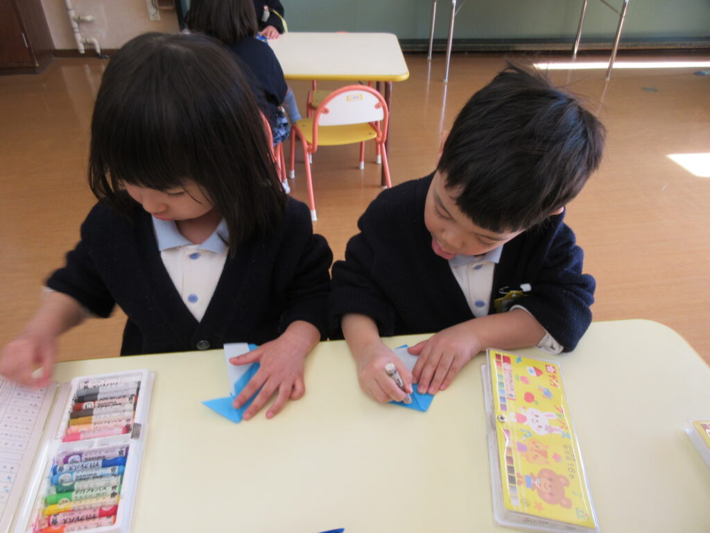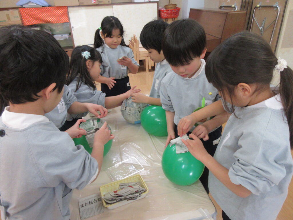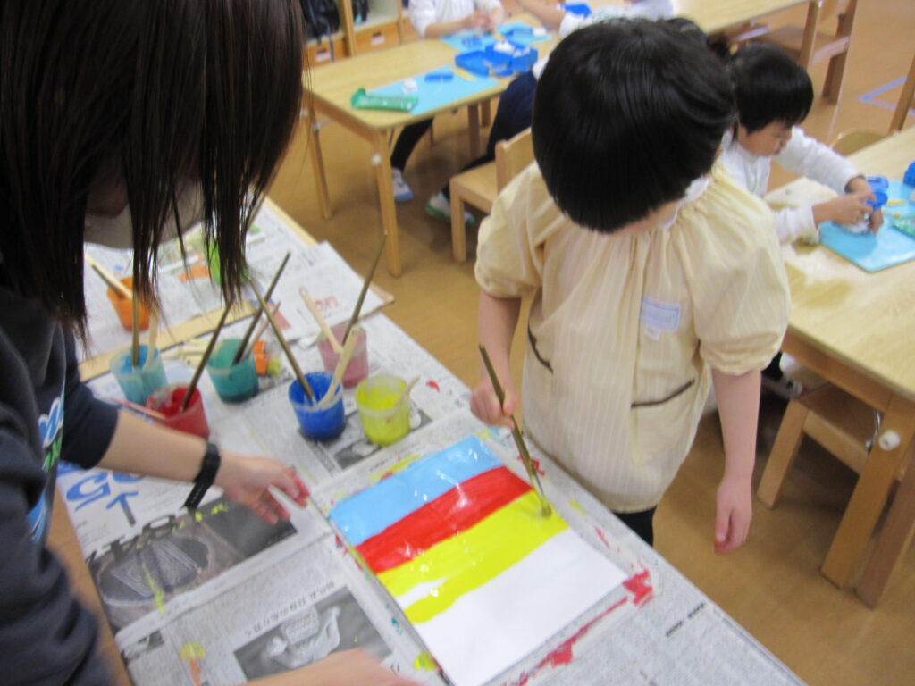 紙袋に絵の具で色を塗り、鬼の顔を作りました。