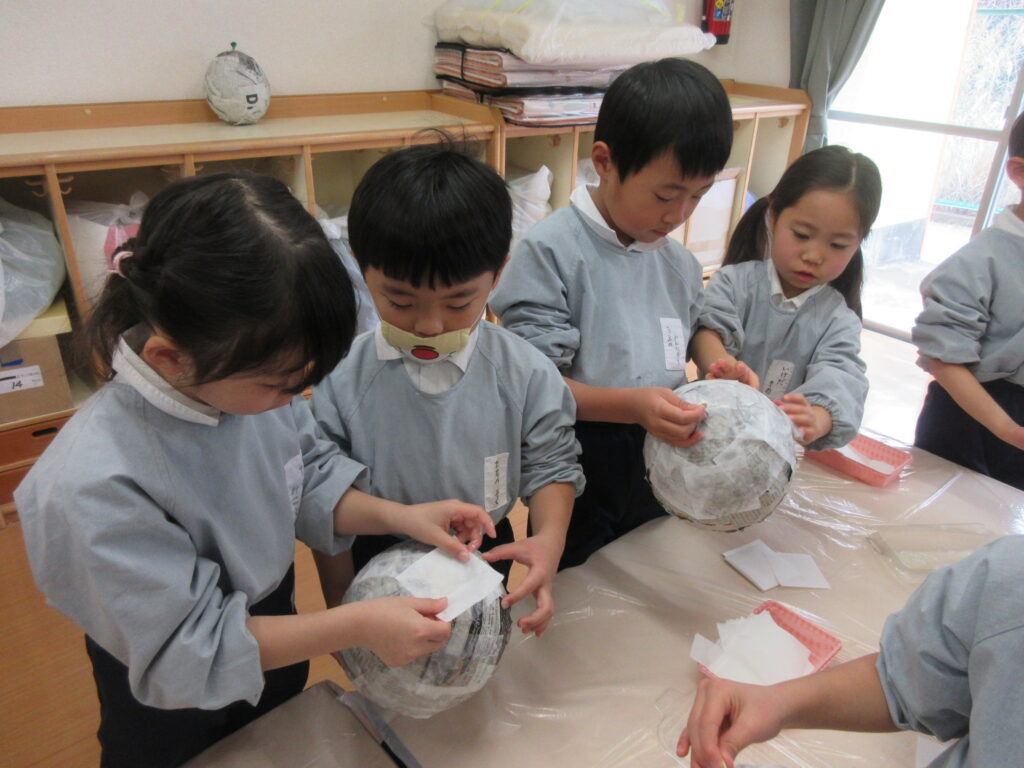 新聞紙が乾いたら、次は和紙を2重に貼ります。