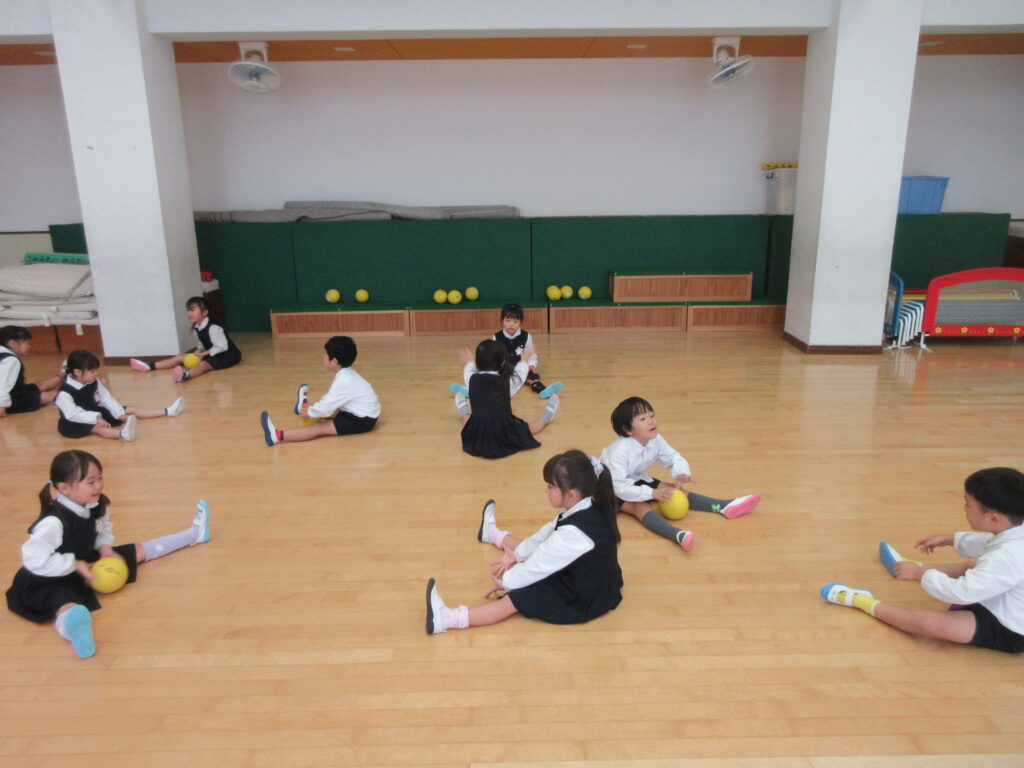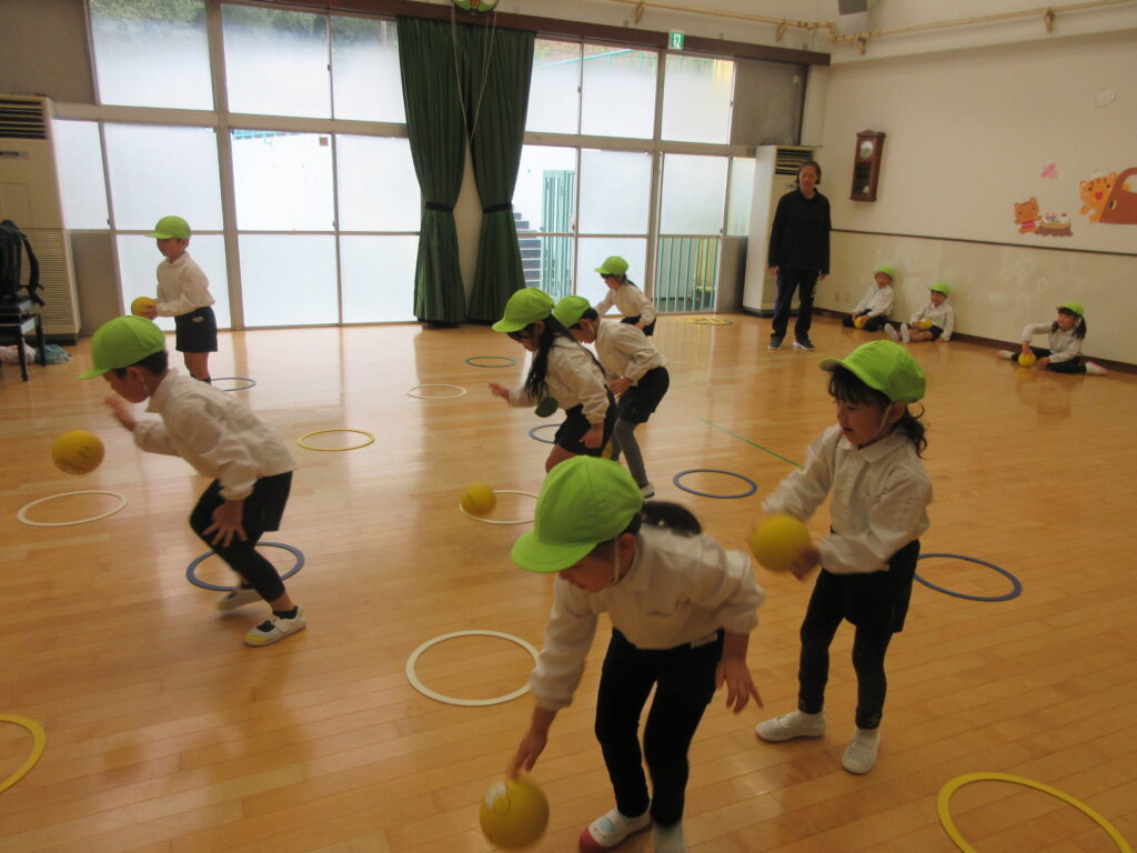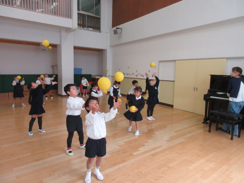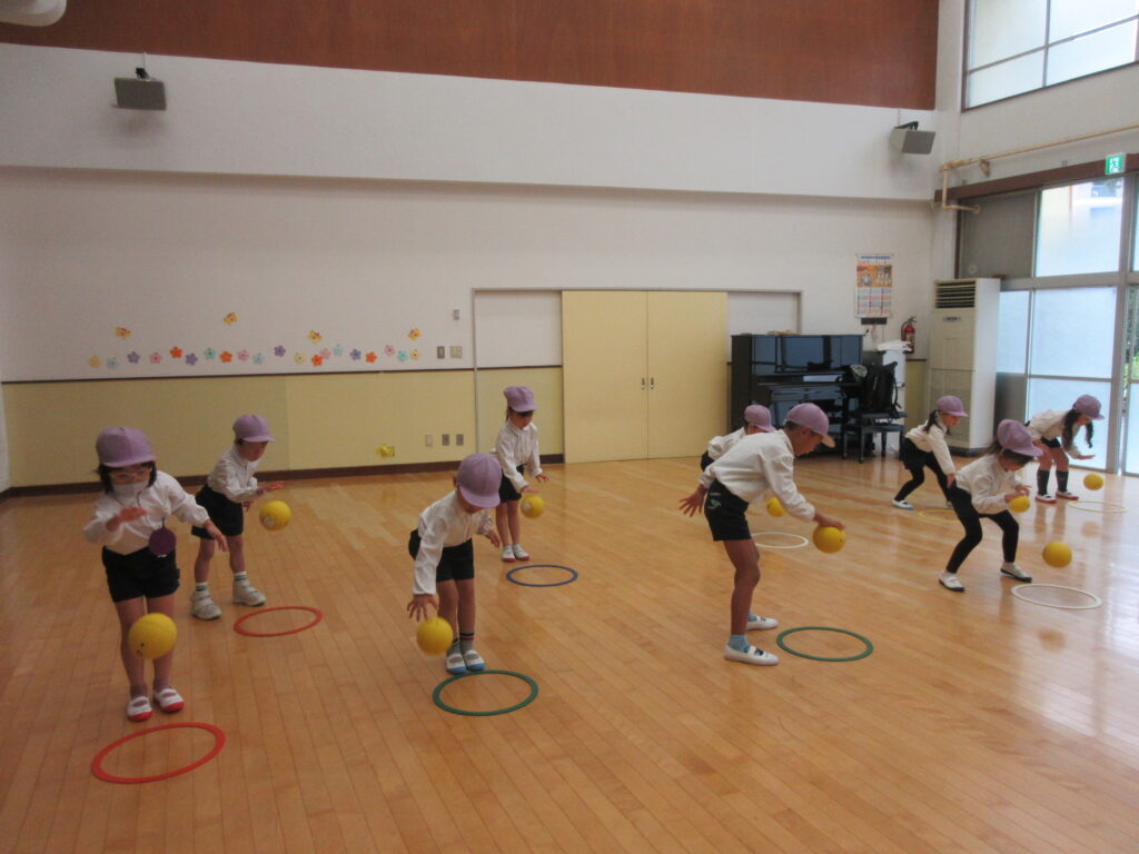 20日(火)リトミック ピアノに合わせてボールをついたり投げたりしました。