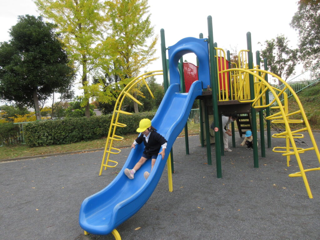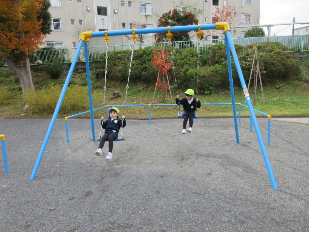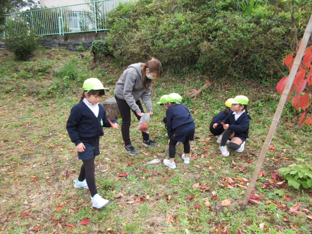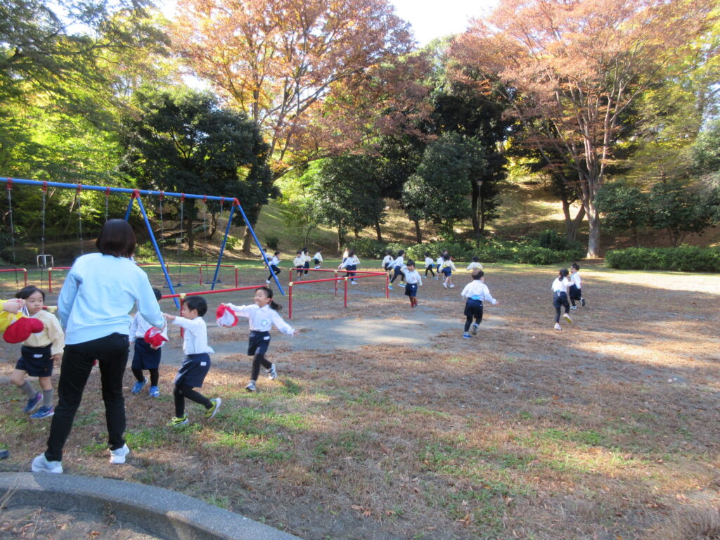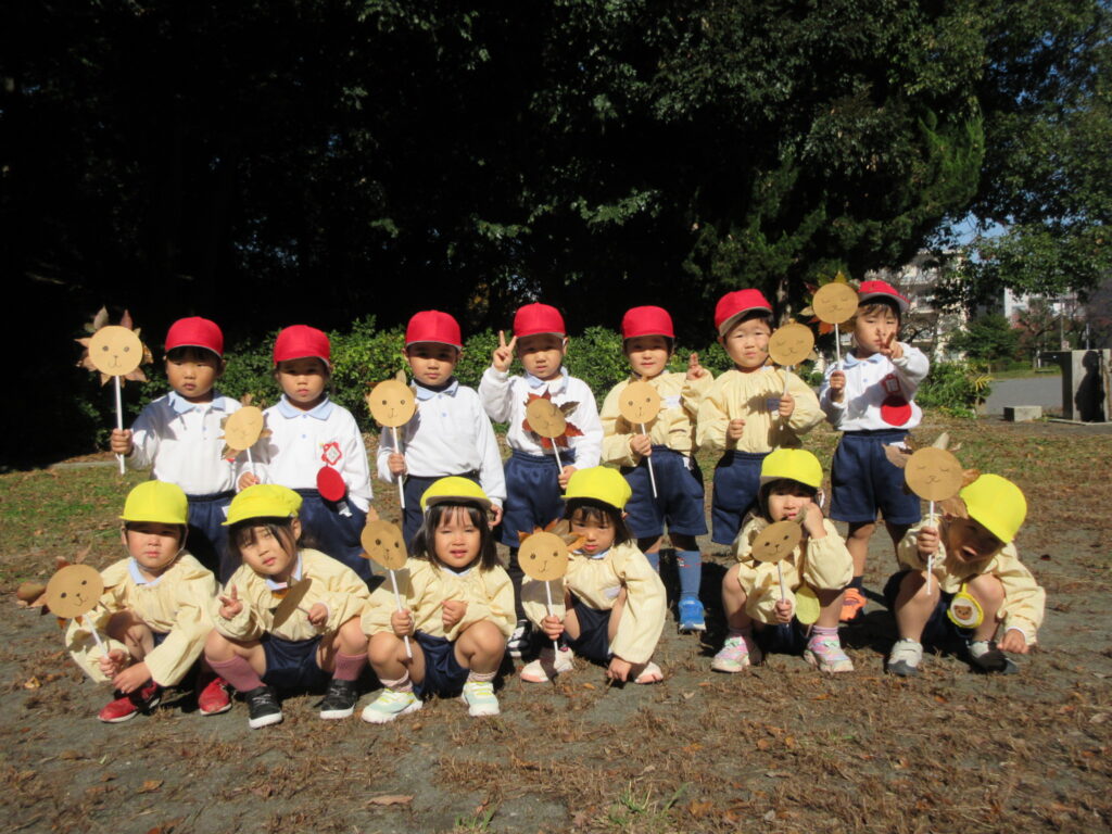 年中さんと一緒に南公園に行きました。落ち葉を拾ってライオンを作りました。