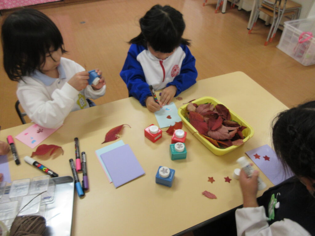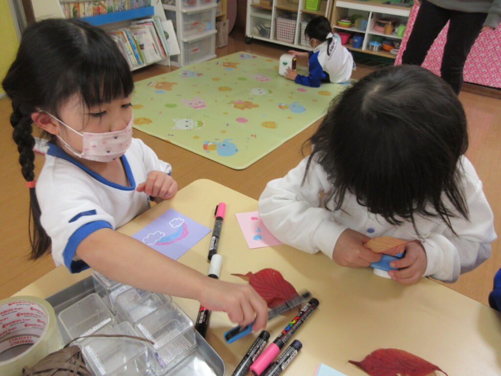 公園で拾ったきれいな色の落ち葉を使って、しおりやポスターカードを作りました。