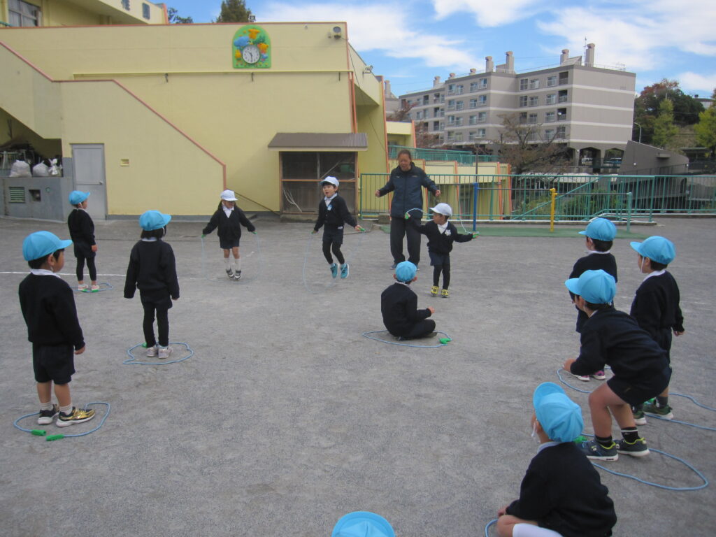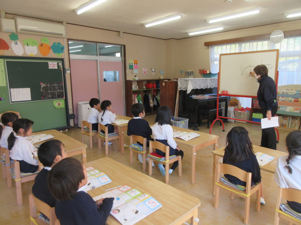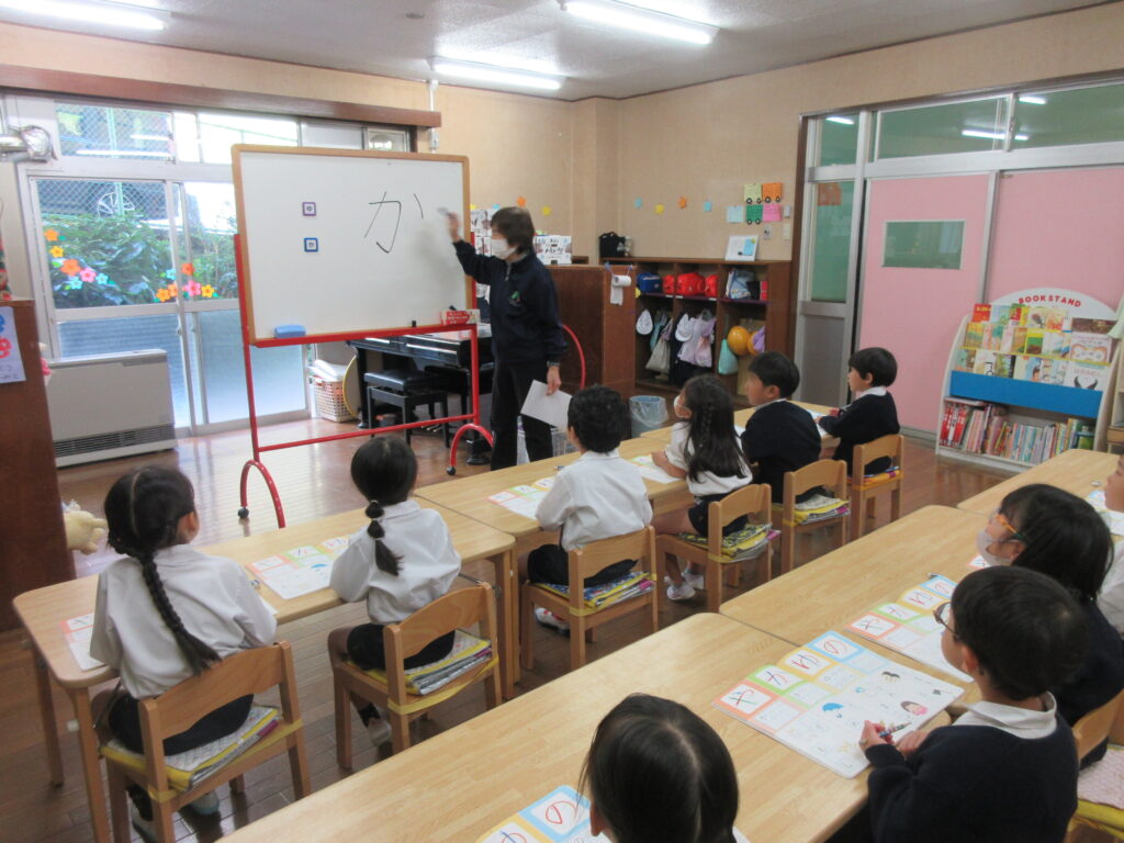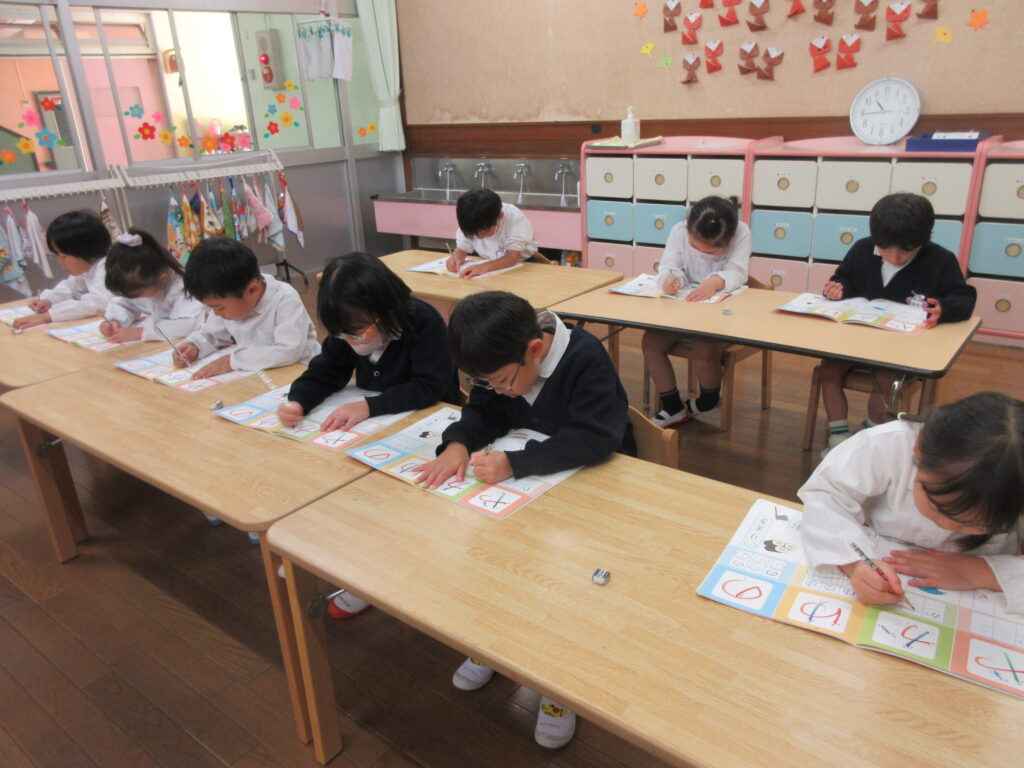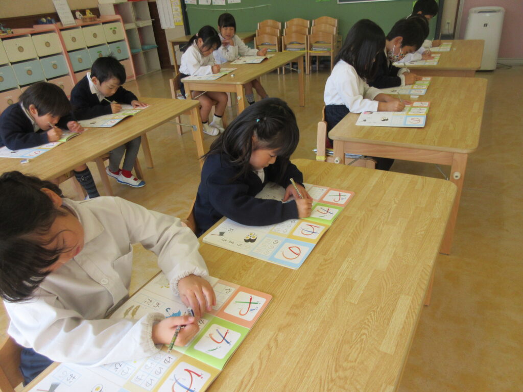 姿勢を正して園長先生の話を聞き、平仮名の練習をしました。