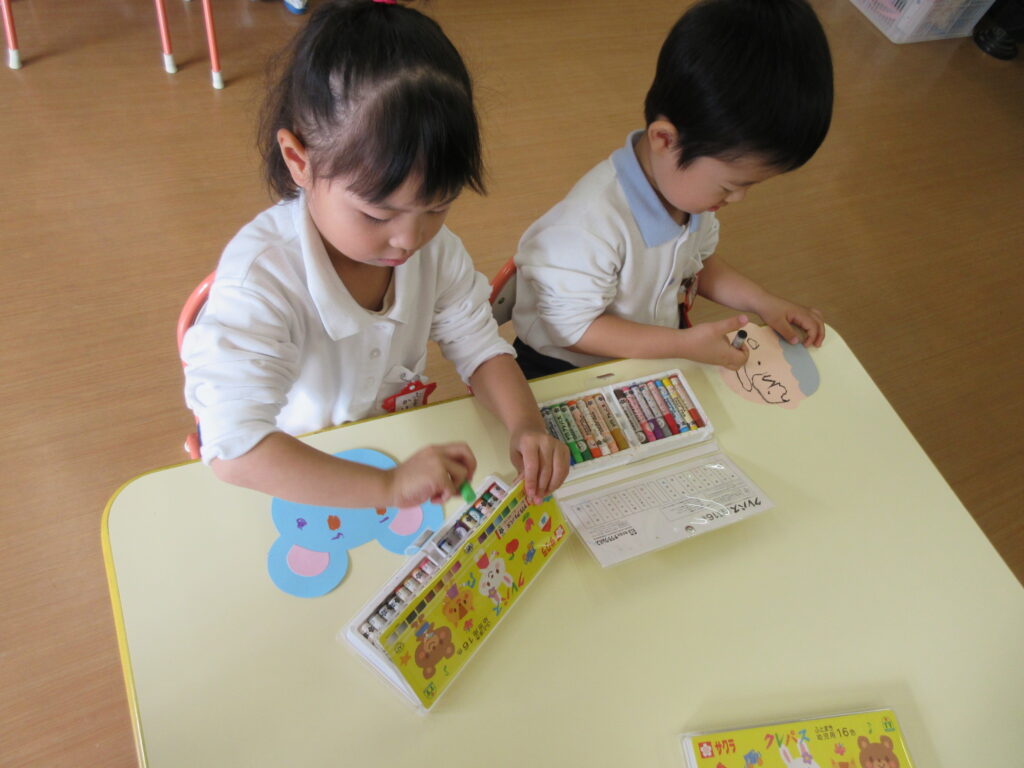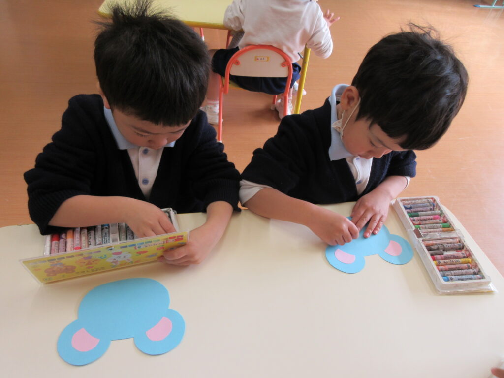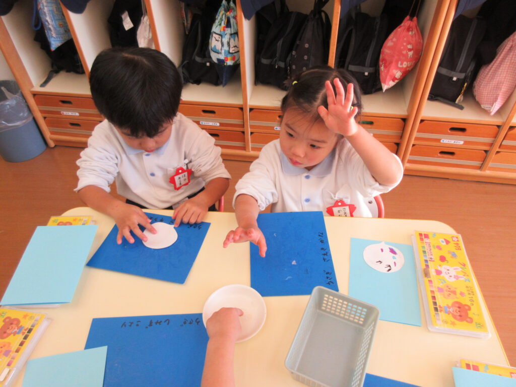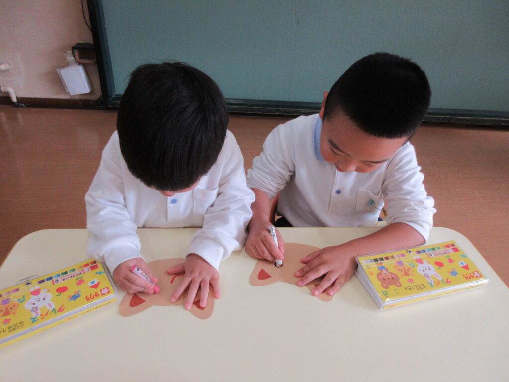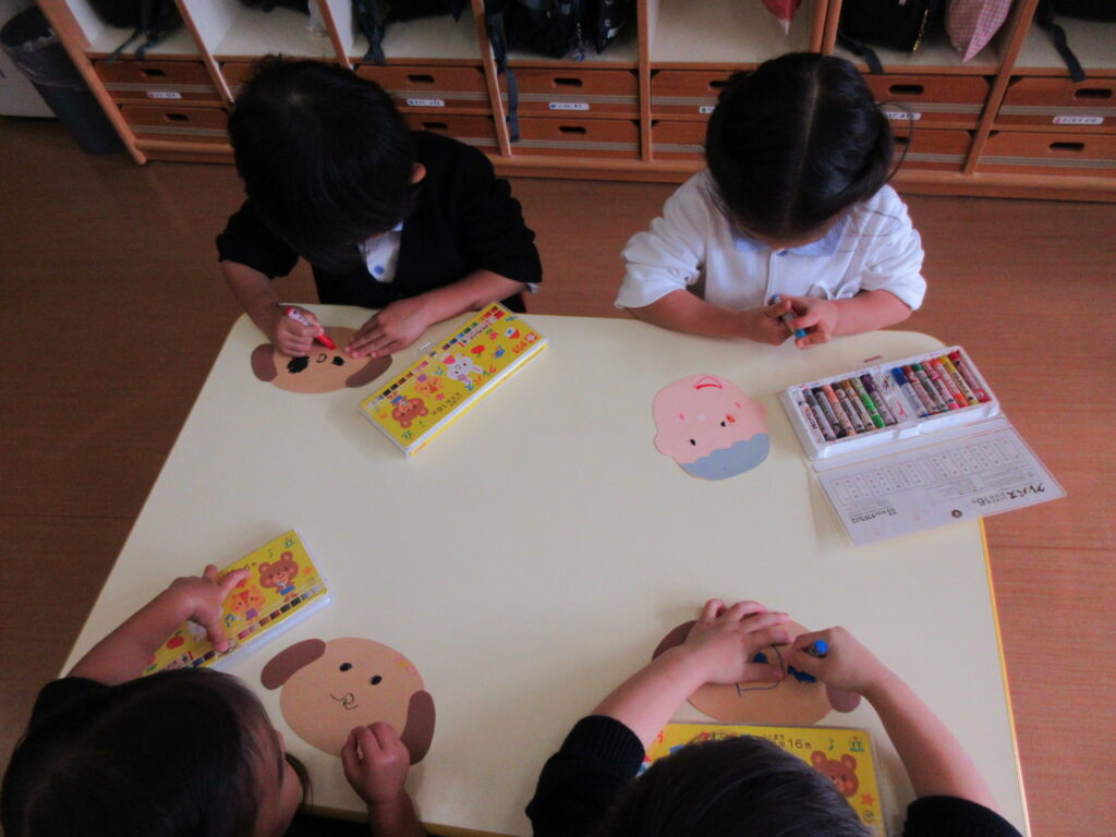 劇の役決めをして、練習用のお面にクレヨンで顔を描きました。