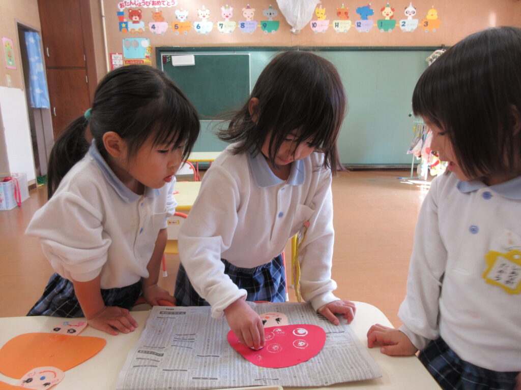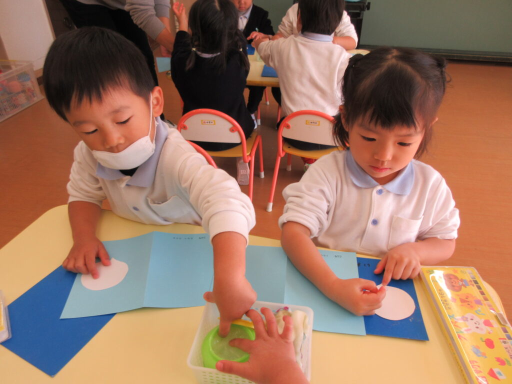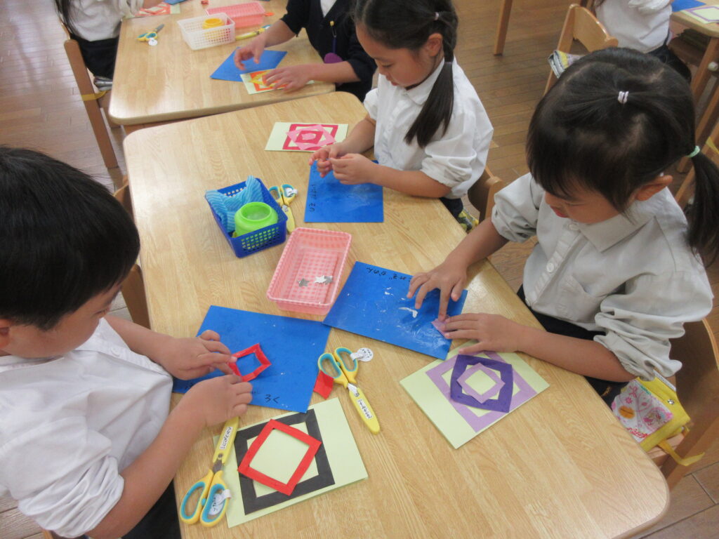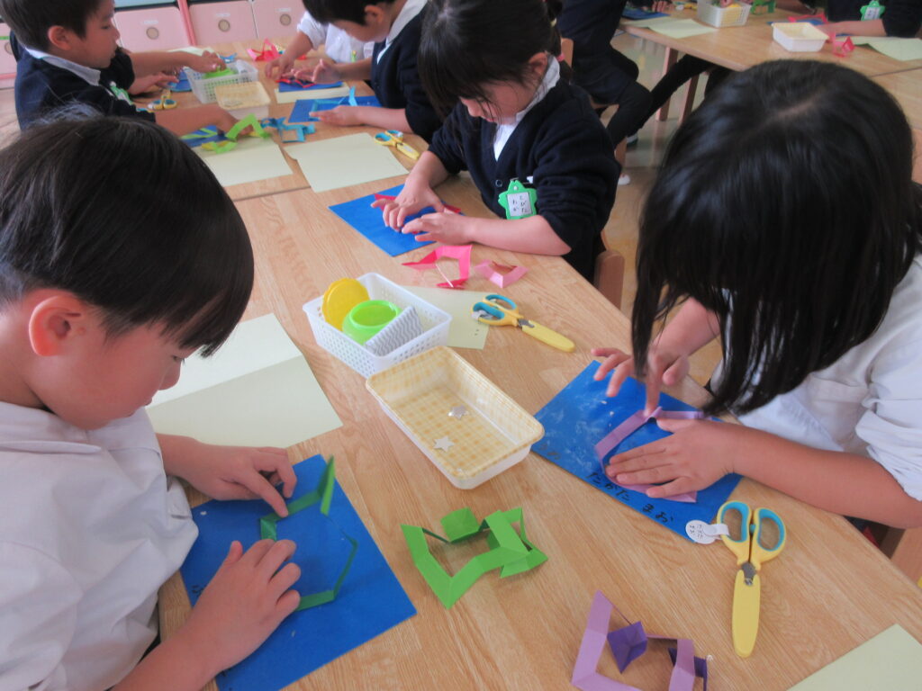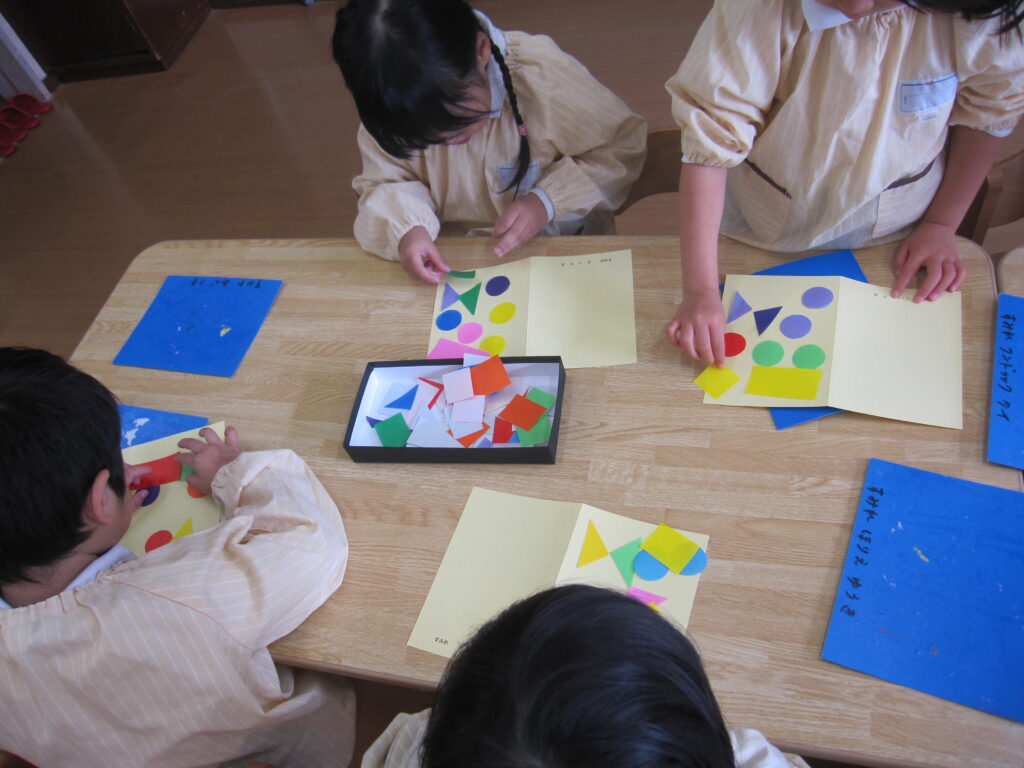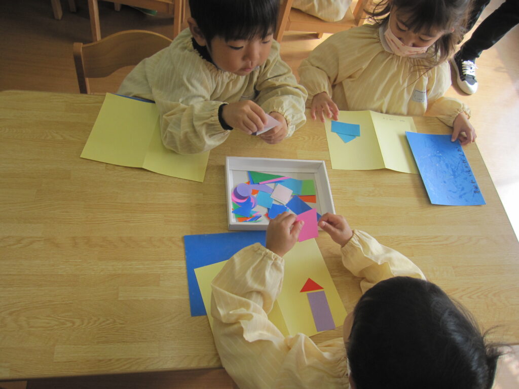 様々な形の折り紙を組み合わせたりして、形遊びをしました。