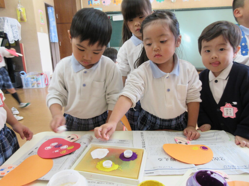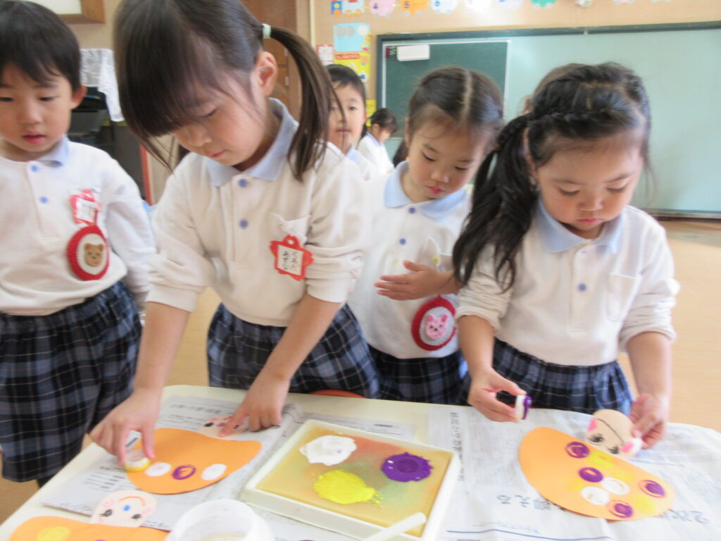 きのこの傘をペットボトルキャップのスタンプで飾り付けをしました。