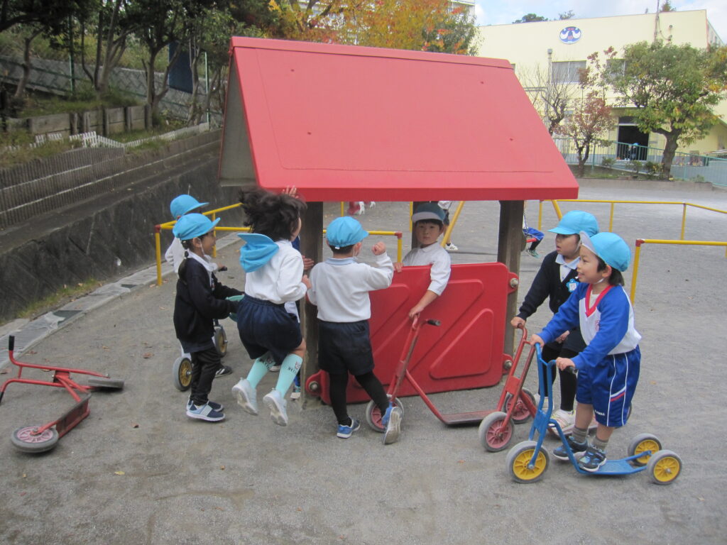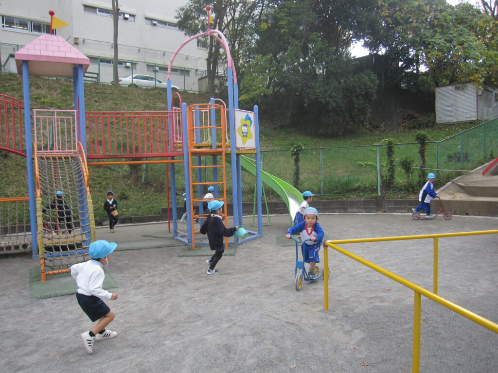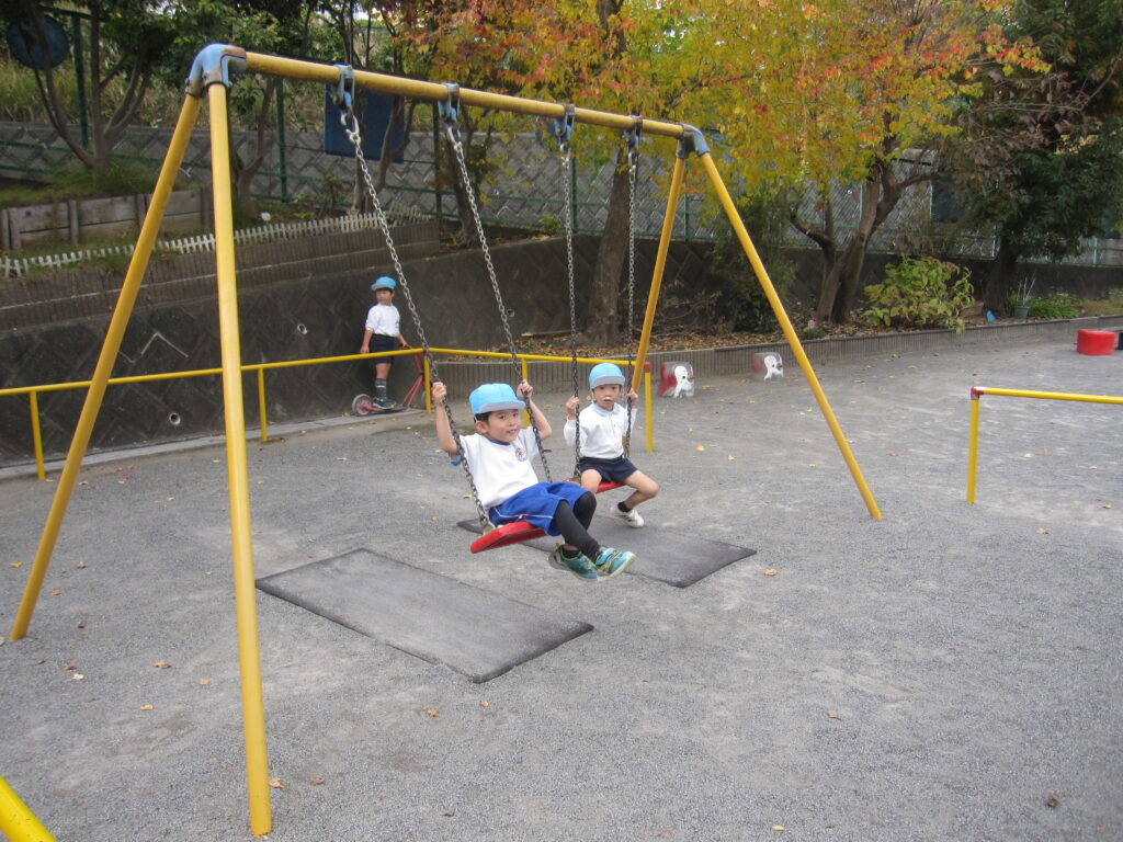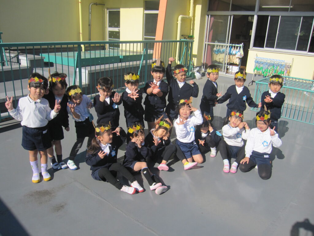 20日(木)園庭の葉っぱを拾って冠を作りました。