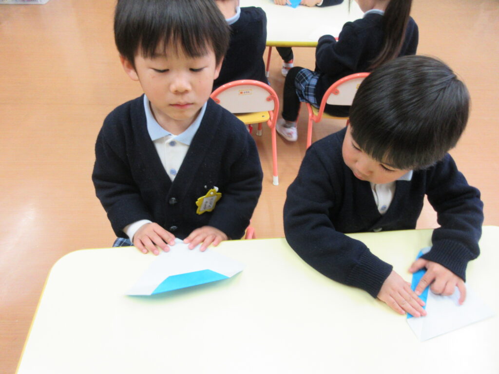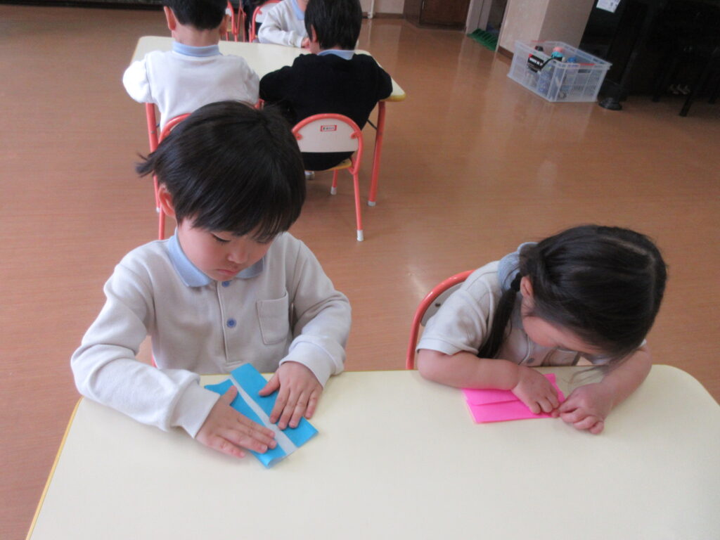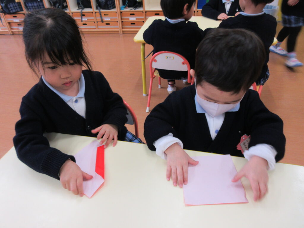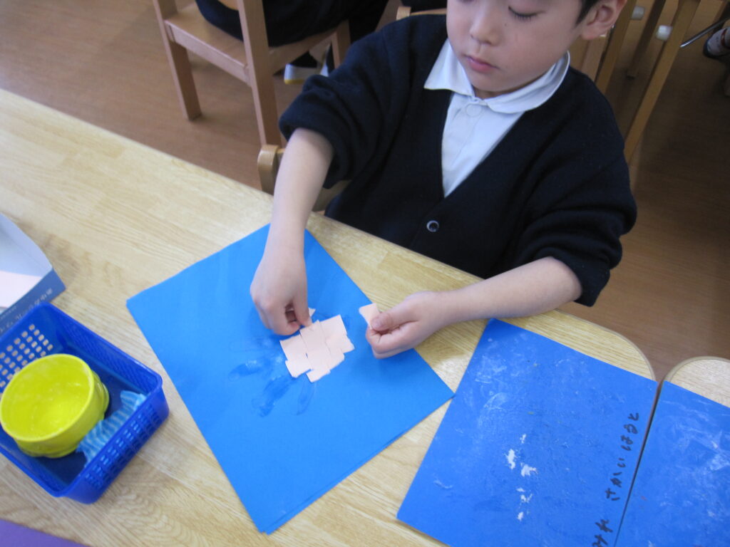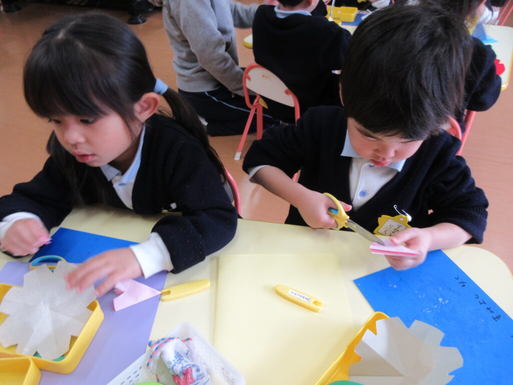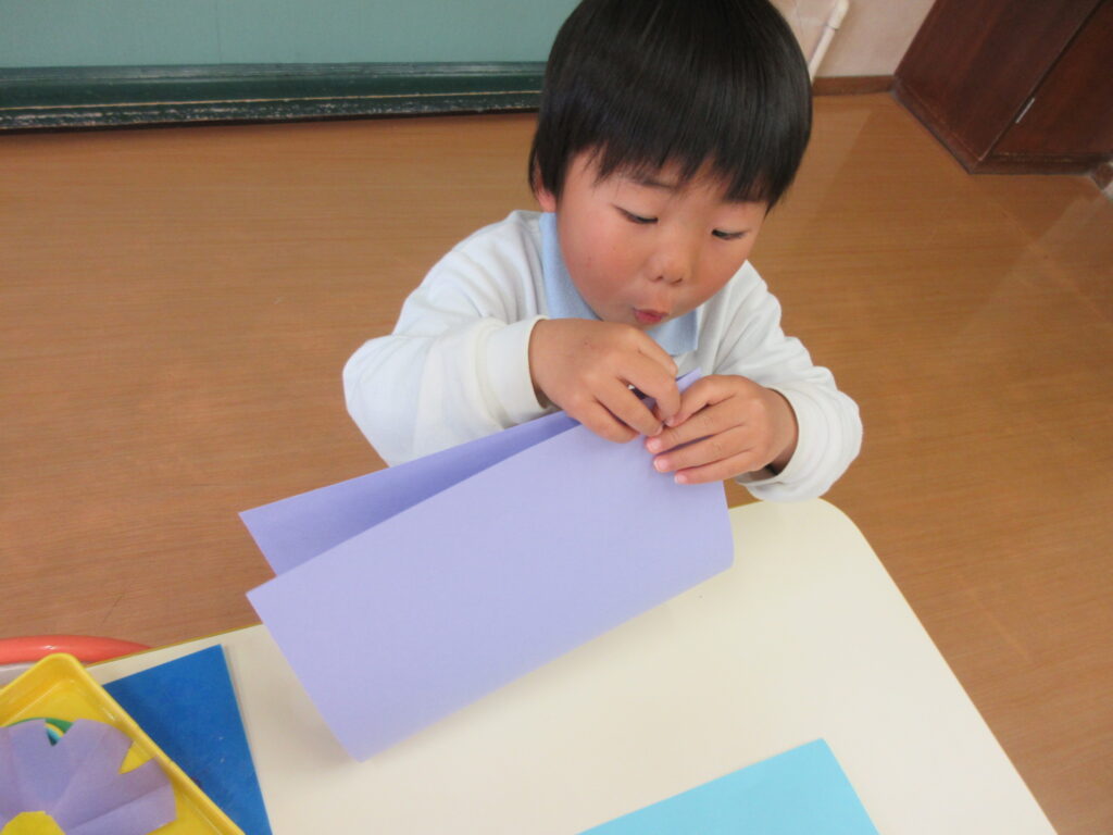 丸い折り紙を3回折り、ハサミで切り込みを入れてお花を作ってのりで貼りました。