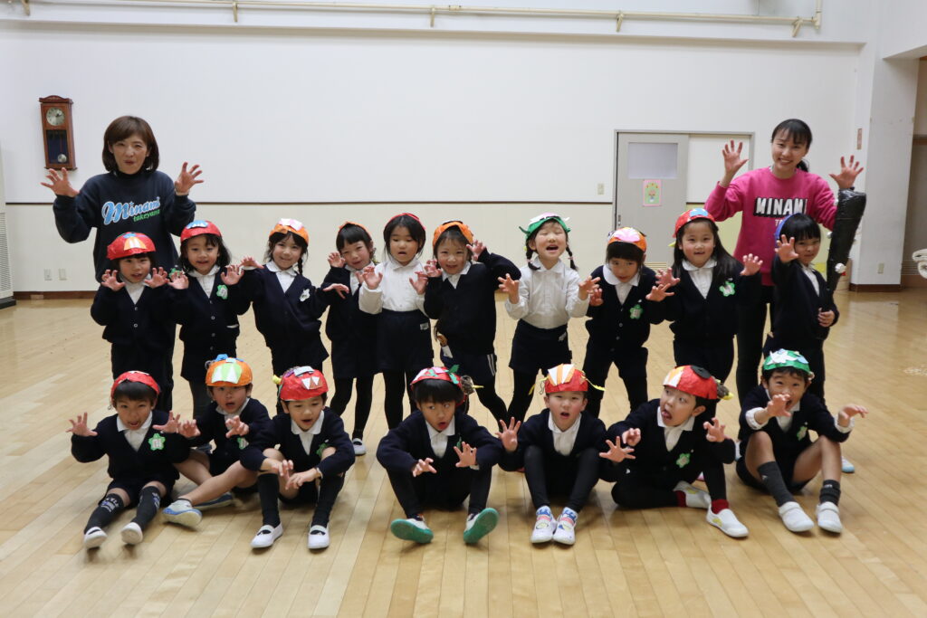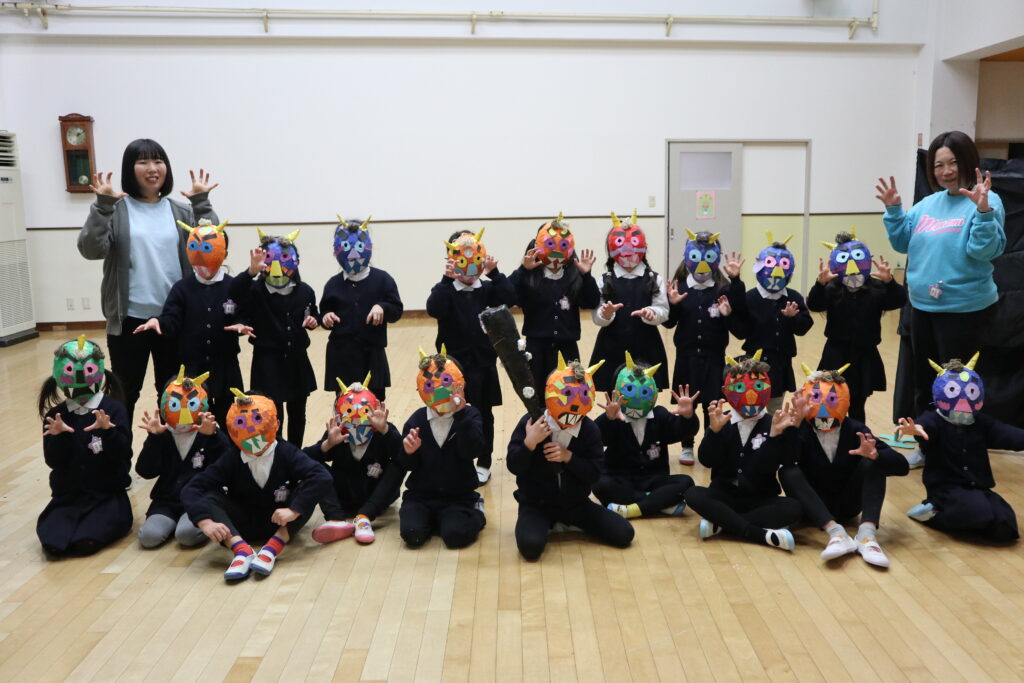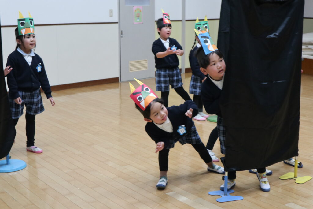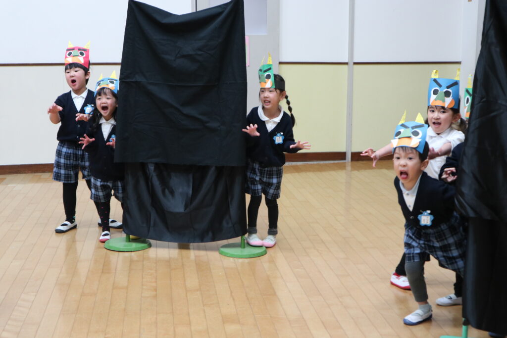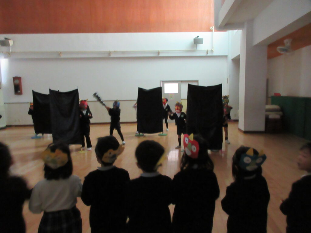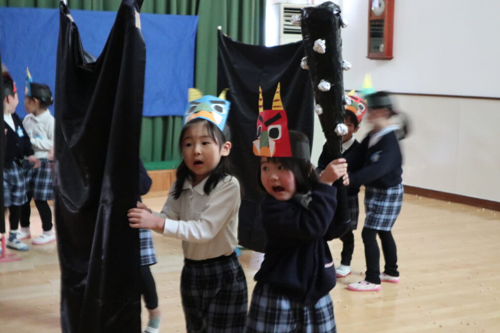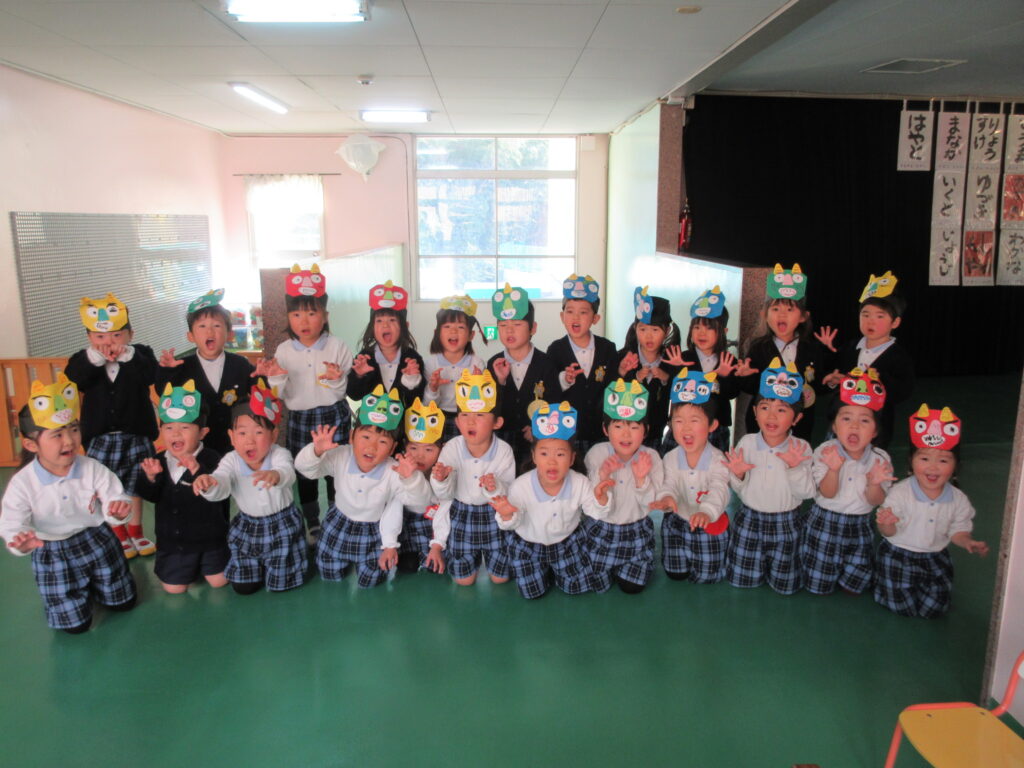 ホールで豆まきをしました。鬼のお面をつけて、鬼役をしました。
