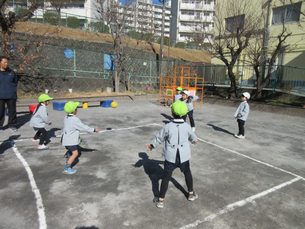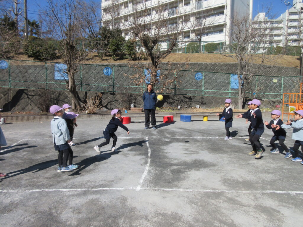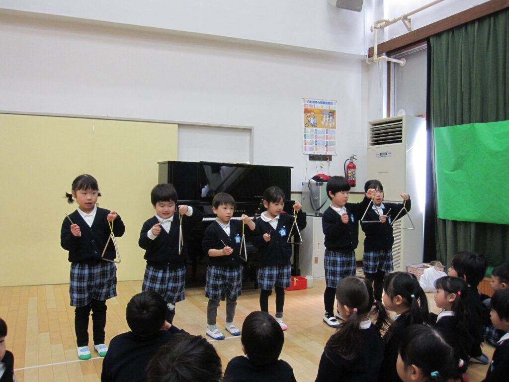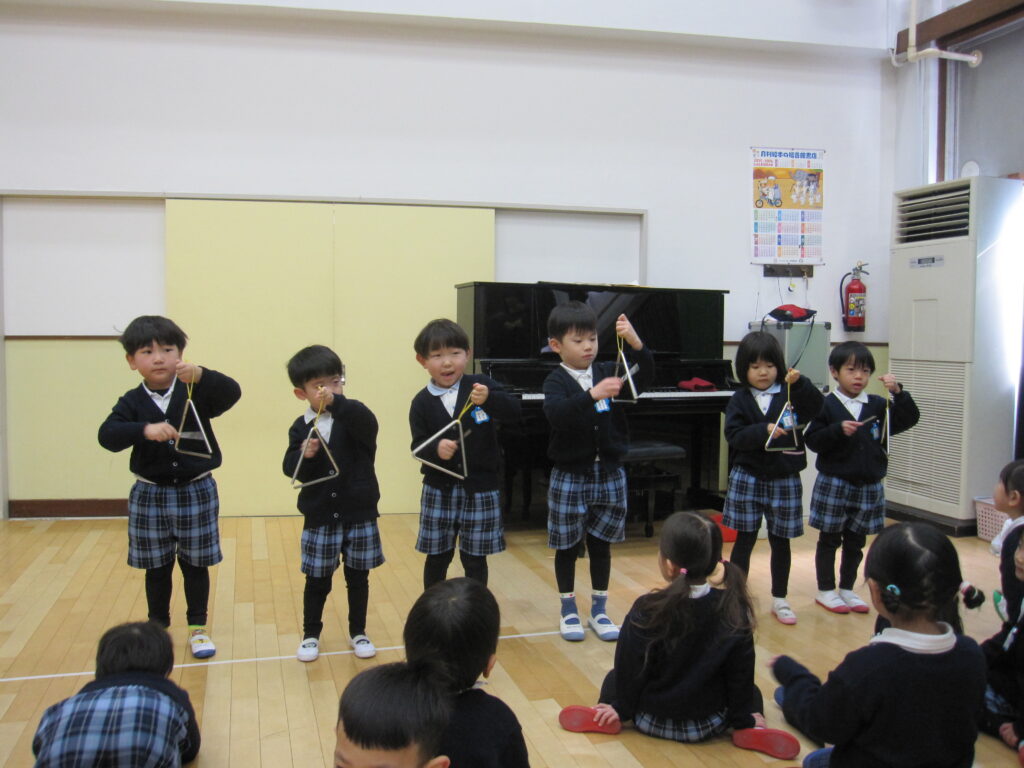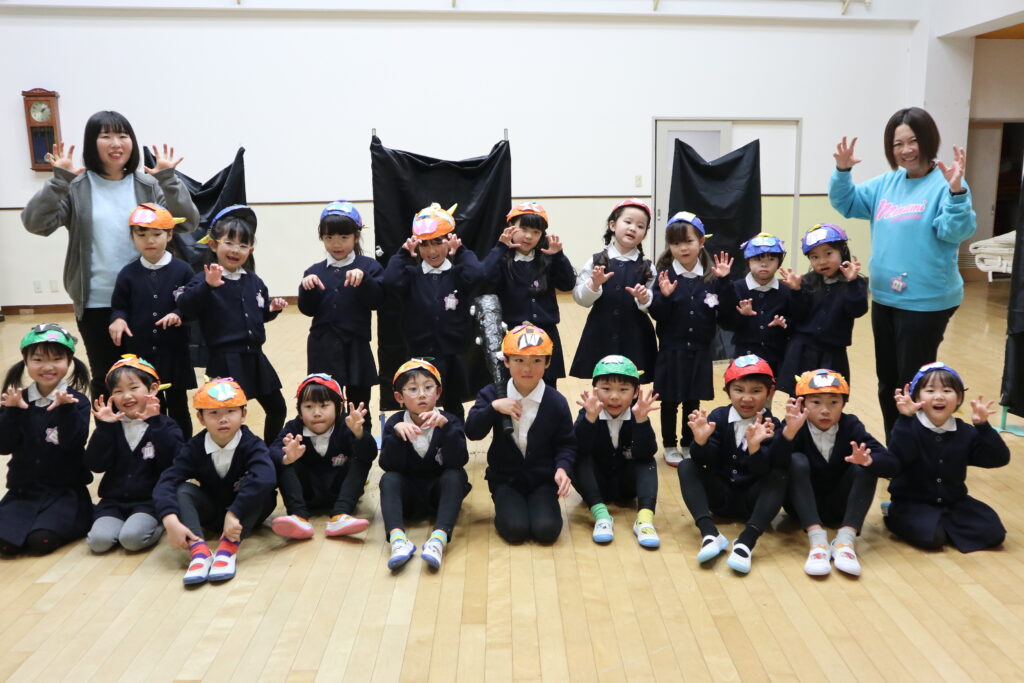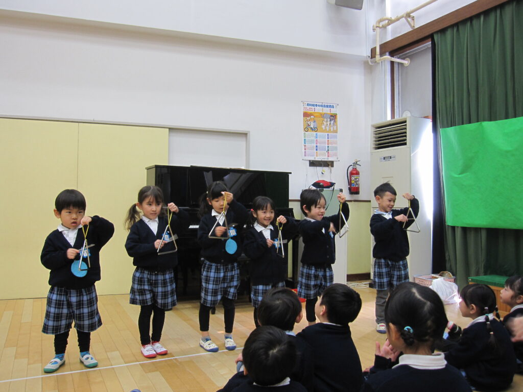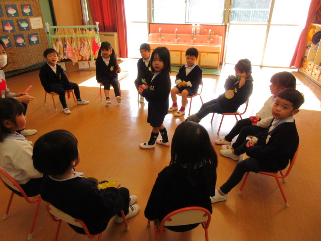 ホールで豆まきをしました。鬼のお面をつけて、鬼役をしました。